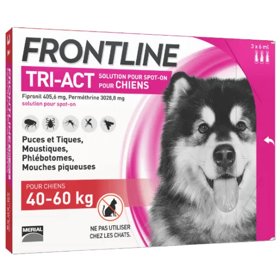 Frontline TRI-ACT Chien XL 40–60 kg est un médicament vétérinaire antiparasitaire externe pour chien, présenté sous forme de solution pour application cutanée en pipette, indiqué dans le traitement et la prévention des infestations par les puces et les tiques ainsi que dans la répulsion des insectes piqueurs, conformément à l’autorisation de mise sur le marché.