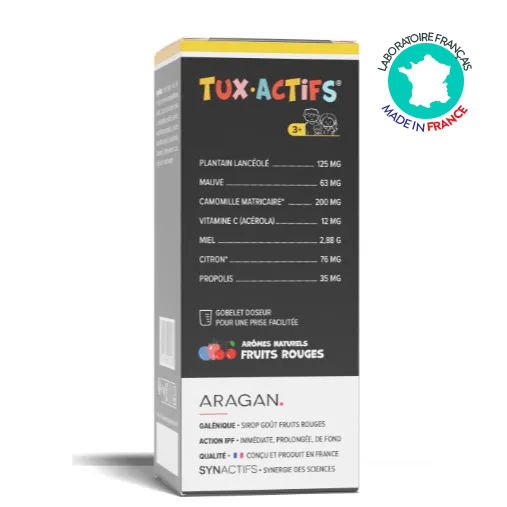 La toux et les maux de gorge chez l’enfant peuvent survenir lors des épisodes hivernaux, des changements de saison ou en cas d’irritation des voies respiratoires. TuxActifs Bio Aragan a été développé pour apporter un soulagement global et naturel, tout en respectant la sensibilité des plus jeunes.