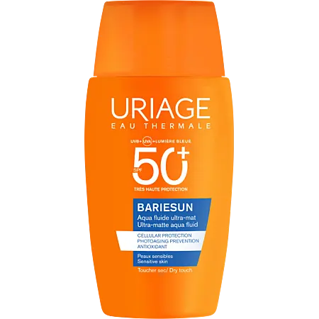 L'Uriage Bariésun aqua fluide ultra mat SPF50+ est une protection solaire très haute indice formulée spécifiquement pour les peaux mixtes à grasses. Sa technologie Skin Shield assure une protection complète contre les UVB, UVA et la lumière bleue, tandis que sa texture ultra-légère et aqueuse garantit un effet anti-brillance instantané et un toucher sec jusqu'à 12 heures.