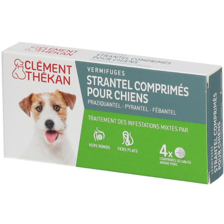 Clément Thékan Strantel Vermifuge pour Chiens est un médicament vétérinaire vermifuge pour chien, présenté sous forme de comprimés, indiqué dans le traitement des infestations mixtes par des nématodes et des cestodes gastro-intestinaux, conformément à l’autorisation de mise sur le marché.