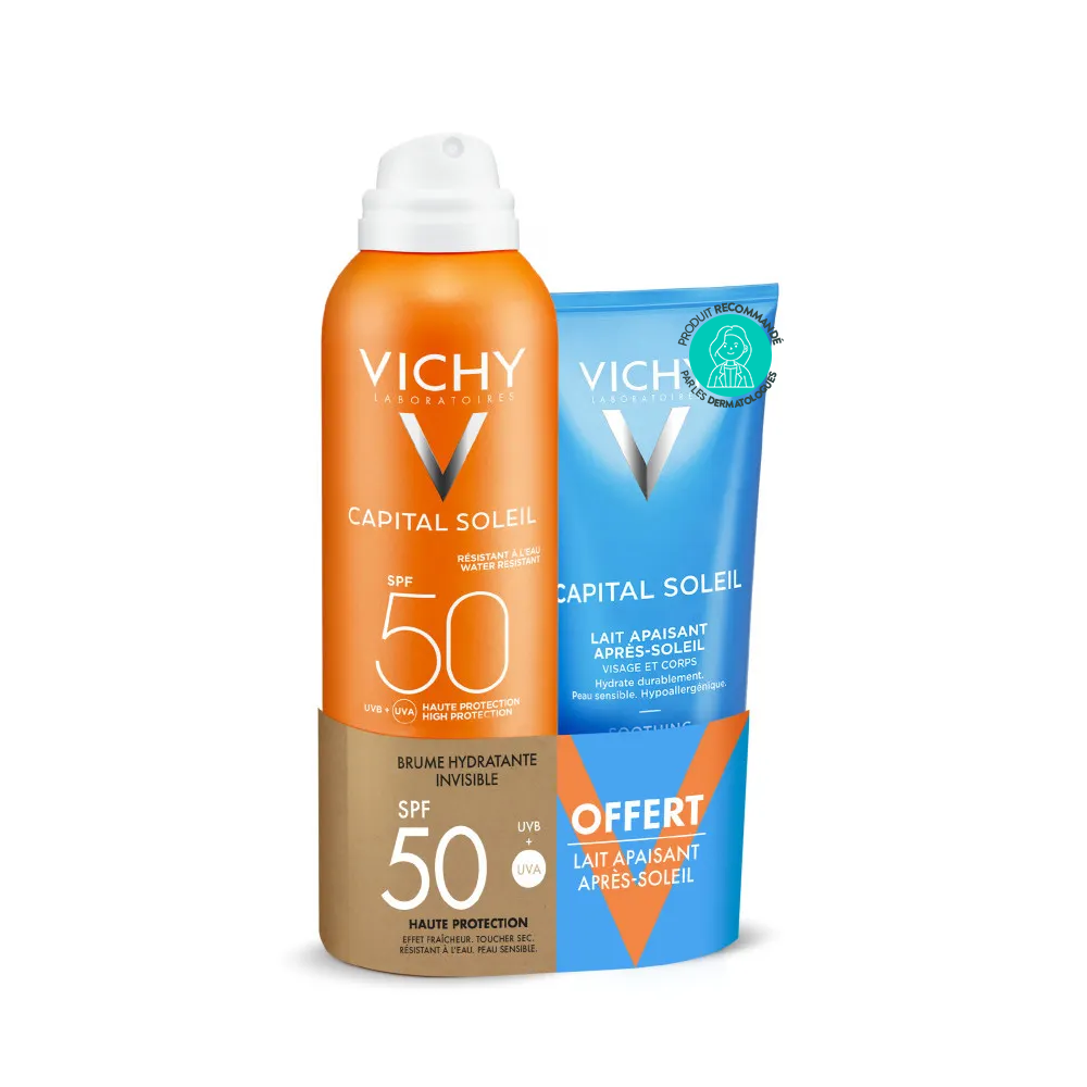 Utiliser Vichy Capital Soleil Brume Hydratante Invisible SPF50 200 ml + Lait Après-Soleil 100 ml Offert – Peaux sensibles