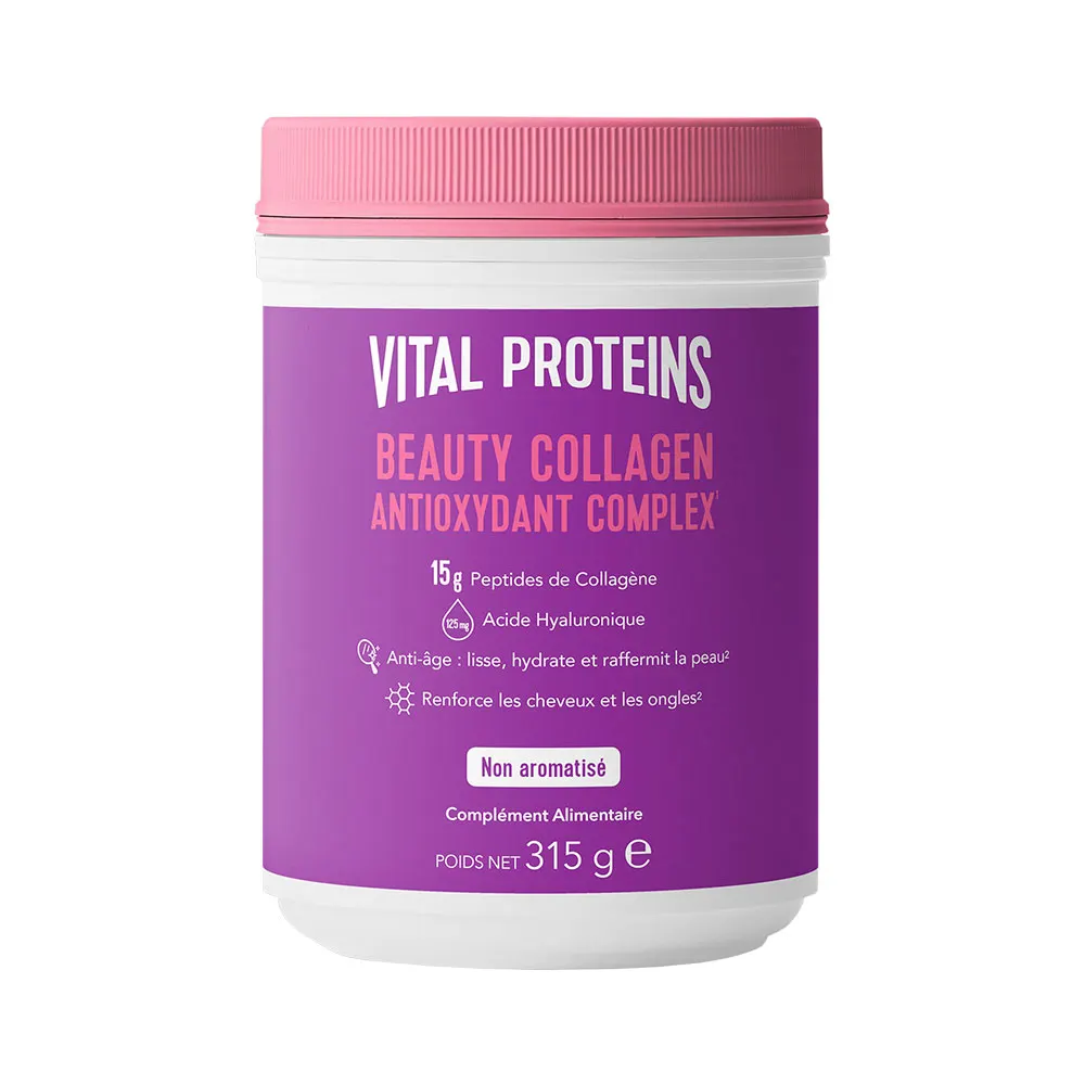 Vital Proteins Beauty Collagen est un complément alimentaire en poudre associant peptides de collagène, acide hyaluronique, zinc et cuivre pour hydrater, lisser et raffermir la peau, tout en renforçant cheveux et ongles.